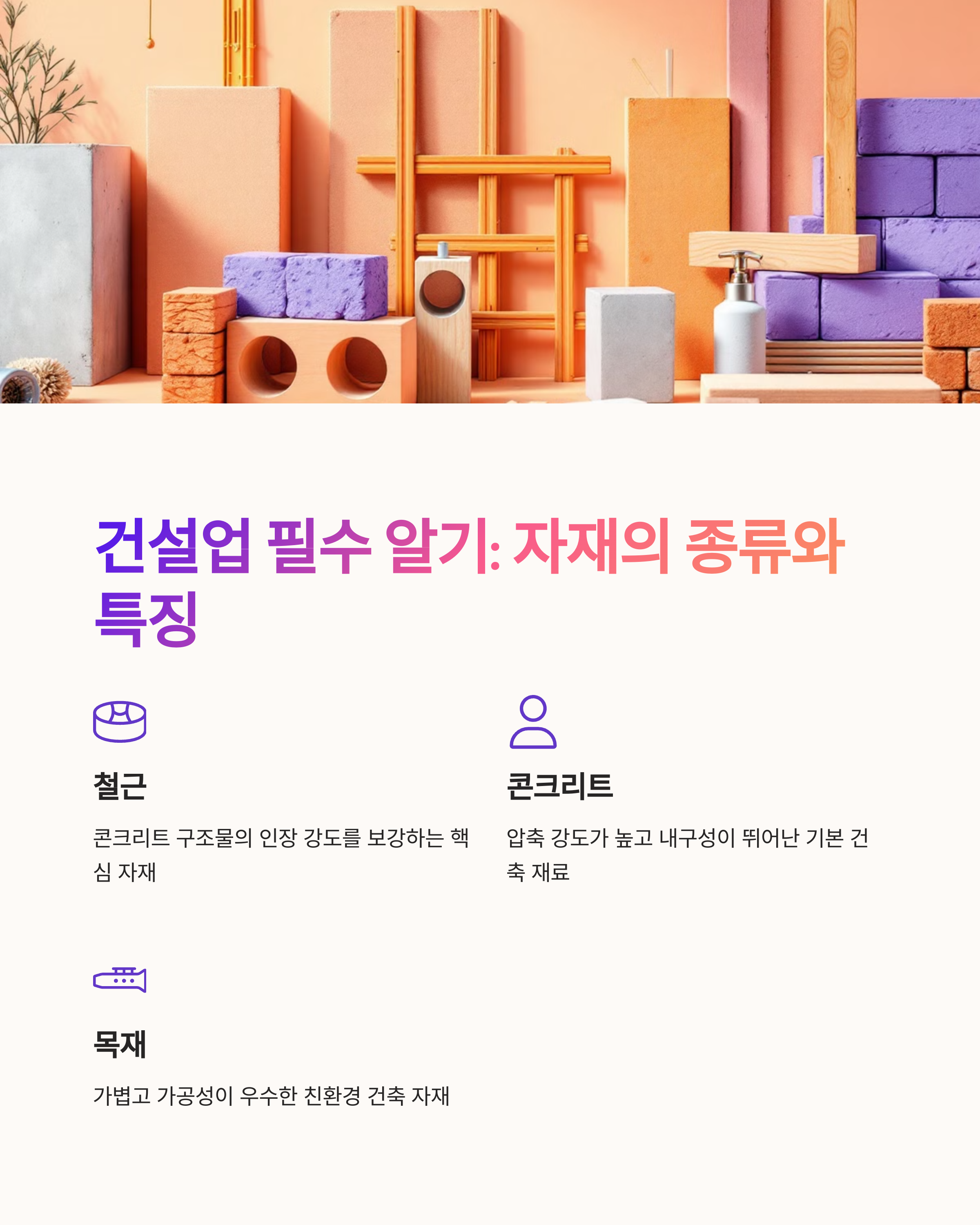 이번 포스팅에서는 건설업에서 자주 사용되는 주요 자재와 그 특징을 정리해 보겠습니다.