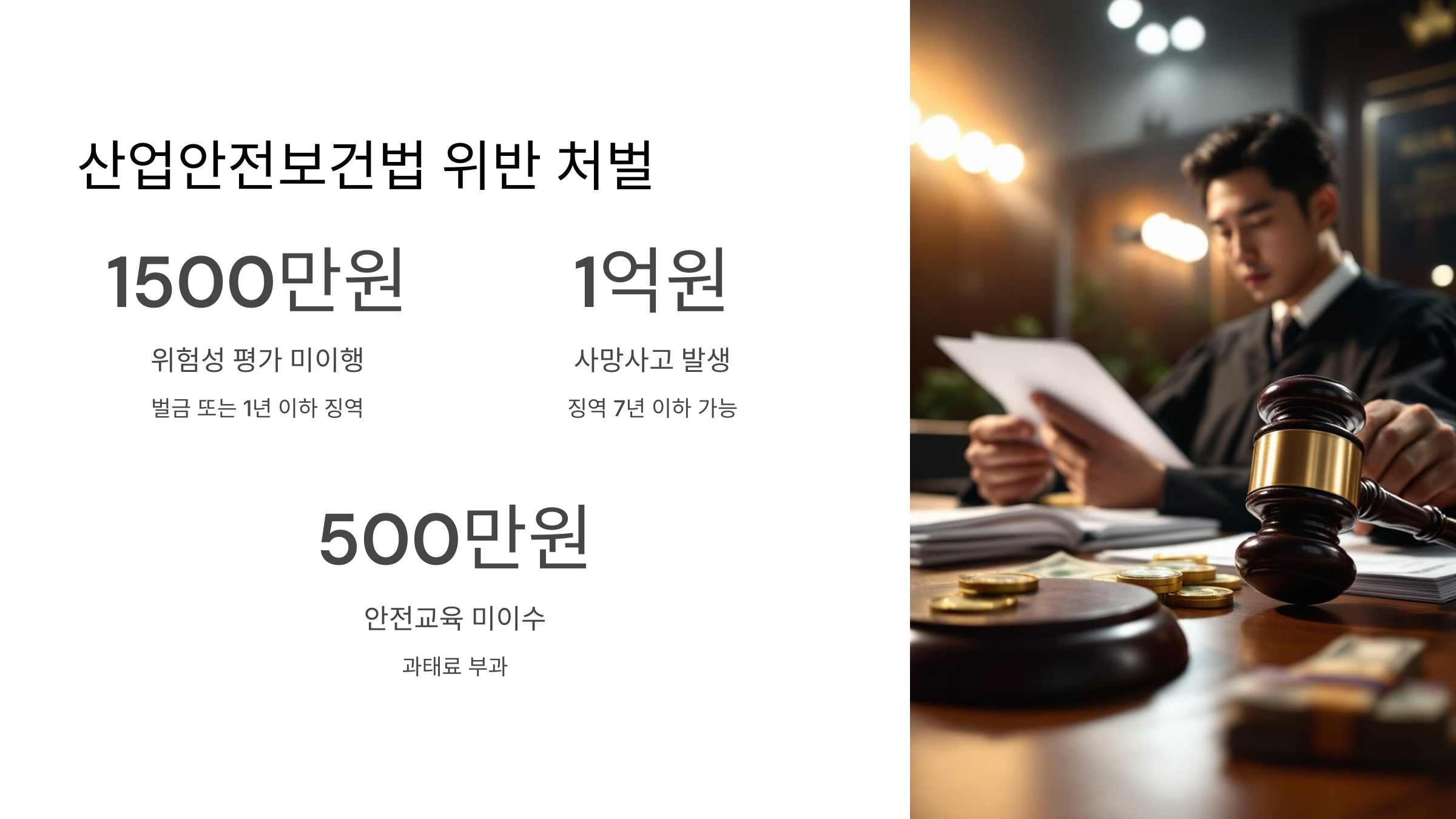 | 위험성 평가 미이행으로 근로자 사망 | 최소 1년 이상 징역 또는 벌금 10억 원 이하 |